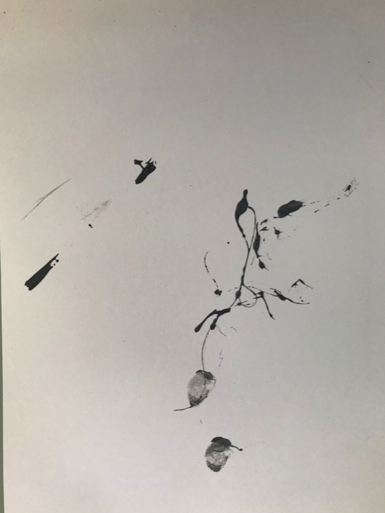 I was struggling with my inexperience (and quite frankly my limited artistic ability) while trying to produce a lino-print. It wasn’t going well. I’m just not good enough! I could see that my exasperation was stifling my connection to the inner child that simply exists to see what happens if I do this…or this….or this. I took three breaths and closed my eyes. Opening my eyes again I saw that a strand of my hair, ink laden, had fallen on my page. What looks (to me, anyway!) like a bird on a blossom branch is actually the result of my desperate attempt to remove the hair from the page. A mistake. But a really satisfying and potentially beautiful mistake, complete with my own fingerprint and DNA! Now, I know my little bird will never make it to the hallowed halls of the Royal Academy or local art gallery. But letting go of the pursuit of perfection freed my mind and opened it to the existence of other possibilities.